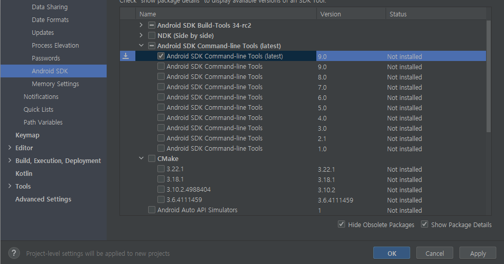 android studio > sdkmanager > android sdk > sdk tools > android sdk command-line tools install apply