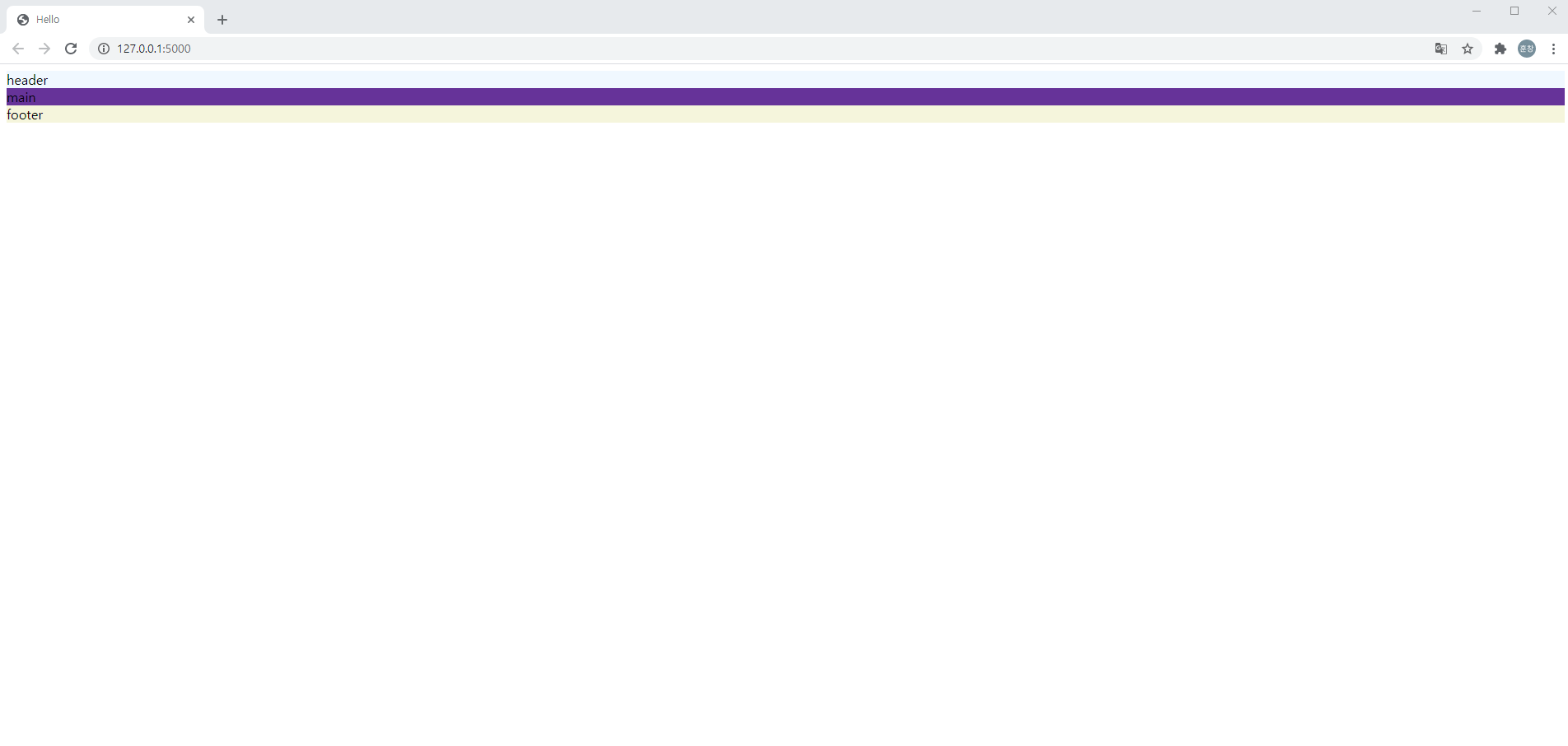 - 별다른 레이아웃이라고 볼 것 없이 header / main / footer 텍스트와 색상만 들어가 있는 모습입니다.