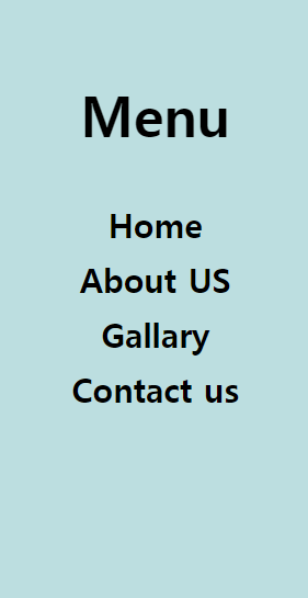 저는 ul tag에는 menu, 각 li 태그들에는 첫 페이지로 돌아갈수 있는 home, 저의 웹사이트를 소개하는 about us, 포트폴리오 gallary, 그리고 저에게 연락할수 있는 contact us를 만들었습니다.