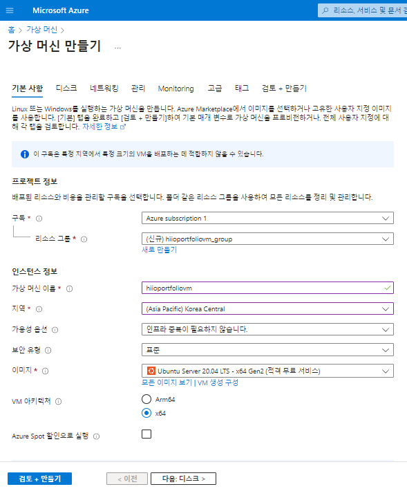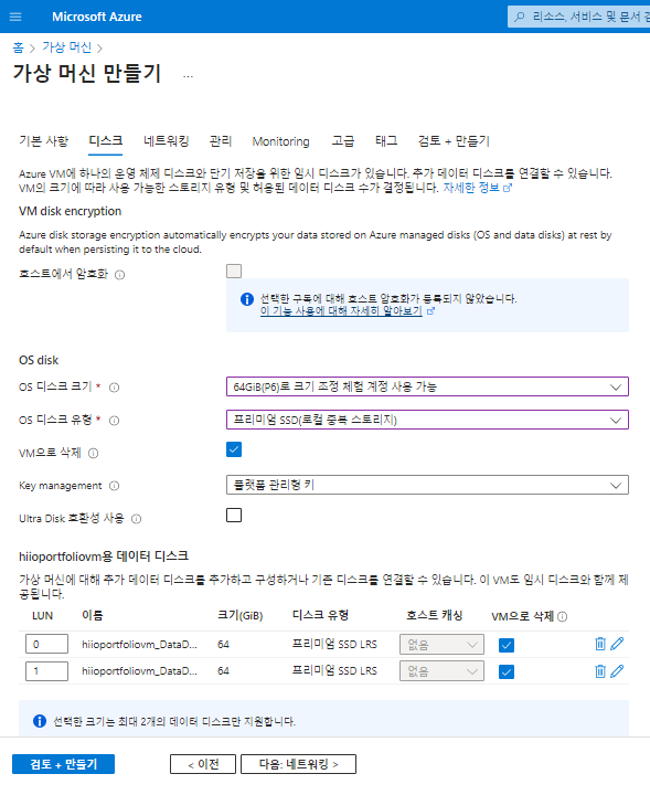 디스크에서 많이 고민을 했던거 같습니다. 무료로 사용하고 싶은데 어떻게 선택하면 좋을까 많이 고민을 하다 그냥 64GB 프리미엄 SSD로 선택을 하고, 데이터 디스크도 64GIB 로 2개 추가해 줬습니다.