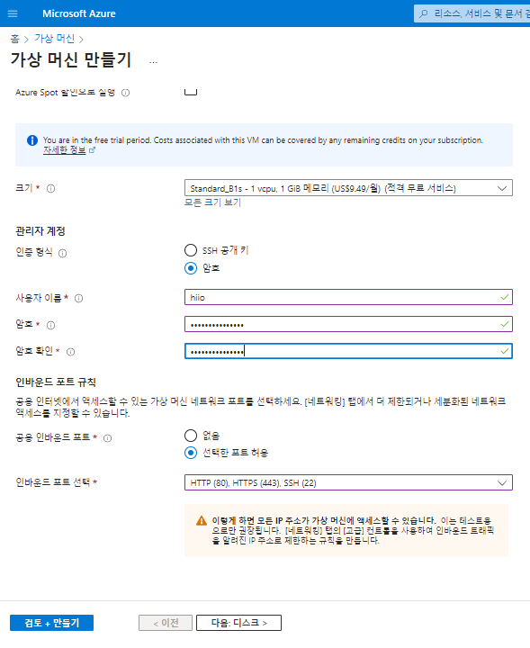 이후 관리자 계정을 선택할 수 있습니다. 인증형식은 SSH와 암호 방식이 있는데, 저는 암호방식이 더 평해서 암호방식으로 선택을 했습니다. 인바운드에는 80,443,22를 기본적으로 선택했습니다.